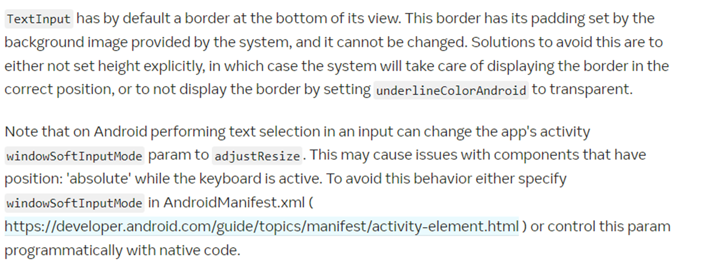 Android에서 입력란에서 텍스트 선택을 수행하면 앱의 활동 windowSoftInputMode 모드 매개변수가 adjustResize로 변경될 수 있습니다. 이는 키보드가 활성화된 상태에서 위치의 구성 요소에 문제를 일으킬 수 있습니다. 이 동작을 피하려면 AndroidManifest.xml에서 windowSoftInputMode를 지정하거나 네이티브 코드로 이 매개변수를 프로그래밍적으로 제어하세요." 그리고 해당 파란색 형광펜으로 해당하는 안드로이드 공식문서를 참조가 되어있습니다. 바로가기