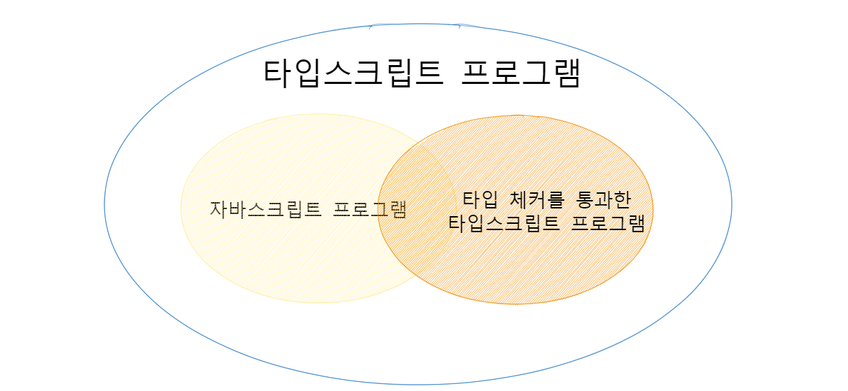 interface State { name: string; capital: string; } const states: State[] = [ { name: "tk", capital: "seoul" }, { name: "kim", capitol: "incheon" }, // 'capital'을 (를) 쓰려고 했습니까? { name: "park", capital: "pusan" }, ]; for (const state of states) { console.log(state.capital); }정리하자면, 벤 다이어그램에 새로운 영역을 추가할 수 있습니다. 타입 체커를 통과한 타입스크립트 프로그램 영역 입니다.
