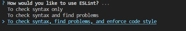 예 ) ESLint를 어떻게 사용할 것인지에 대한 선택 옵션 설정 # 1. ESLint 사용 방식 선택 ? How would you like to use ESLint? … To check syntax only To check syntax and find problems ❯ To check syntax, find problems, and enforce code style # 2. 모듈 타입 선택 ? What type of modules does your project use? … ❯ JavaScript modules (import/export) CommonJS (require/exports) None of these # 3. 프레임워크 선택 ? Which framework does your project use? … ❯ React Vue.js None of these # 4. TypeScript 사용 여부 선택 ? Does your project use TypeScript? › No / Yes -> Yes # 5. 코드 실행 환경 선택 ? Where does your code run? … (Press <space> to select, <a> to toggle all, <i> to invert selection) ✔ Browser ✔ Node # 6. 코드 스타일 설정 방식 선택 ? How would you like to define a style for your project? … ❯ Use a popular style guide Answer questions about your style # 7. 스타일 가이드 선택 Which style guide do you want to follow? … ❯ Standard:https://github.com/standard/eslint-config-standard-with-typescript XO: https://github.com/xojs/eslint-config-xo-typescript # 8. 구성 파일 형식 선택 ? What format do you want your config file to be in? … ❯ JavaScript YAML JSON # 9. 필요한 의존성 설치 여부 확인 Checking peerDependencies of eslint-config-airbnb@latest The config that you've selected requires the following dependencies: eslint-plugin-react@^7.28.0 eslint-config-airbnb@latest eslint@^7.32.0 || ^8.2.0 eslint-plugin-import@^2.25.3 eslint-plugin-jsx-a11y@^6.5.1 eslint-plugin-react-hooks@^4.3.0 ? Would you like to install them now? › No / Yes -> Yes # 10. 패키지 매니저 선택 ? Which package manager do you want to use? … npm ❯ yarn Pnpm- ESLint 사용 방식 선택 -> "To check syntax, find problems, and enforce code style"