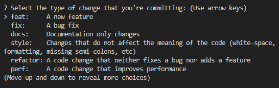 module.exports = { extends: ['@commitlint/config-conventional'], rules: { 'type-enum': [ 2, 'always', [ 'build', 'chore', 'ci', 'docs', 'improvement', 'feat', 'fix', 'perf', 'refactor', 'revert', 'style', 'test', ], ], }, };이처럼 배열안의 feat, fix, chore 등과 같은 키워드들이 git commit시에 커밋 유형을 지정하도록 설정에 나타나게 합니다.